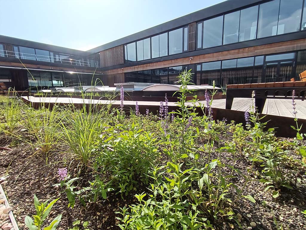 Une végétation adaptée : Généralement des plantes résistantes comme les sedums, les graminées ou des arbustes, selon le type de toiture.